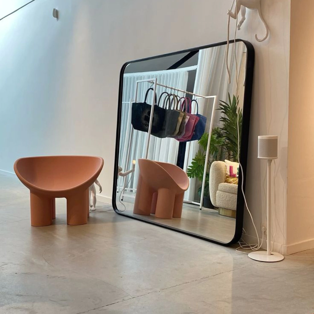 Este espejo se puede colgar horizontal o verticalmente, o simplemente apoyar en el piso. En la base, cuenta con un burlete antideslizante de PVC de 4mm de color negro que también evita marcas en el suelo.